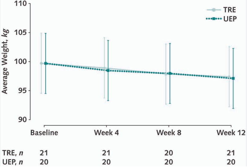 - Πιο συγκεκριμένα το γκρουπ της διαλειμματικής νηστείας (TRE) έτρωγε εντός ενός 10ωρου παραθύρου, ενώ το γκρουπ της συνεχόμενης πρόσληψης (UEP), είχε περιθώριο μέχρι και 16 ώρες για την κατανάλωση των γευμάτων του στο διάστημα των 12 εβδομάδων