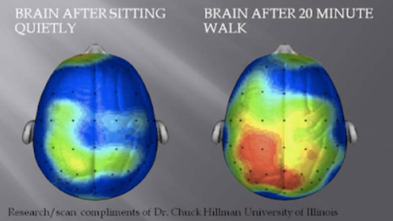 Με μόλις 20 λεπτά περπάτημα παρατηρήθηκε αυξημένη εγκεφαλική δραστηριότητα (Η δεξιά εικόνα - το συγκεκριμένο είδος δραστηριότητας συνδέεται γενικότερα με το κομμάτι της ευτυχίας) εξού και η αλλαγή στο χρώμα και πιο συγκεκριμένα αυξημένη συγκέντρωση-προσοχή και ταχύτερη επεξεργασία πληροφοριών.