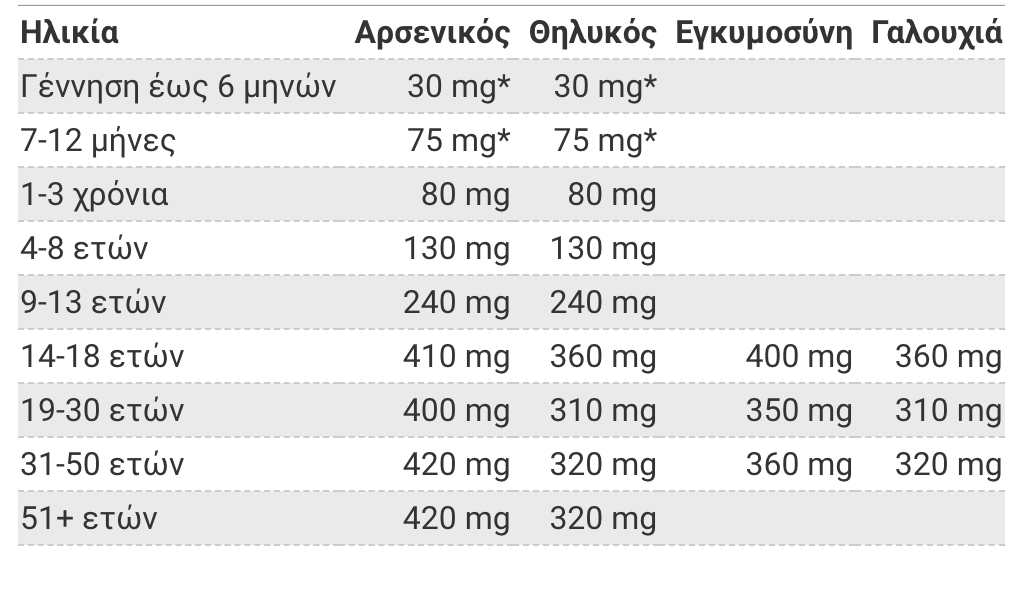 Η ποσότητα μαγνησίου που χρειαζόμαστε εξαρτάται από την ηλικία και το φύλλο. Οι μέσες ημερήσιες συνιστώμενες ποσότητες αναφέρονται στον παρακάτω πίνακα σε χιλιοστόγραμμα (mg) [1]